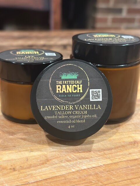 The Fatted Calf Ranch Whipped Tallow Cream offers pure, effective skincare with just three ingredients: 100% grass-fed, grass-finished tallow, organic cold-pressed jojoba oil, and pure organic essential oils.